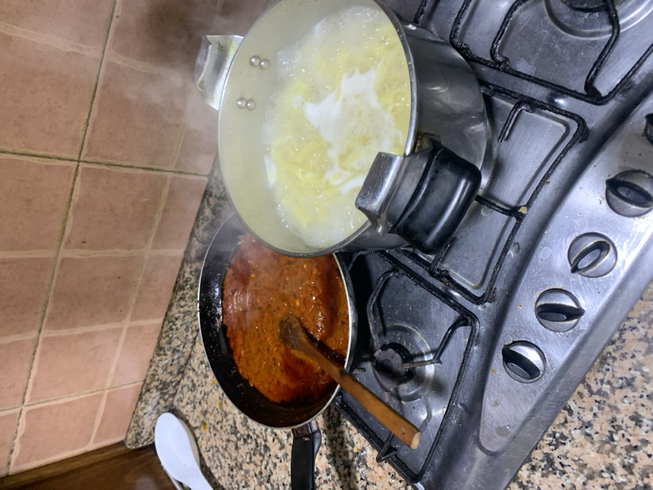 A pot of boiling pasta sits precariously on a stove, its contents bubbling vigorously. Below, a pan filled with simmering red sauce awaits. A wooden spoon rests in the sauce. The stove is stainless steel with black grates and knobs on the right. The countertop is light brown with speckled patterns. A white spoon lies on the counter next to the pan. The angle is slightly tilted.