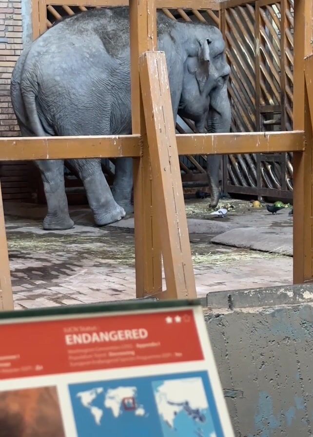 An Asian elephant stands behind a wooden fence in its enclosure at a zoo. A sign indicating the elephant is an endangered species is visible in the foreground, out of focus. Pigeons walk around the enclosure floor. The enclosure is a concrete room with a brick wall. The elephant moves slightly, but mainly stands still.