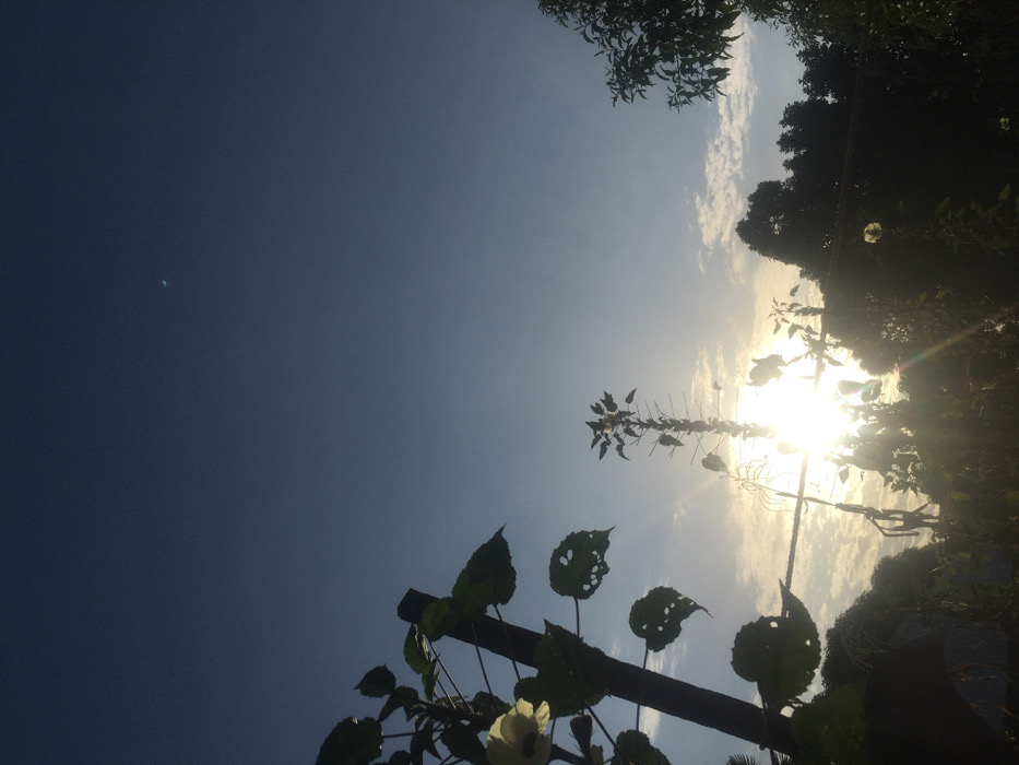 Sunlight bursts through foliage. A bright glare obscures details of tall plants and dense shrubbery on the right. A climbing plant with green leaves and white flowers is in the lower left, supported by a dark wooden structure. The sky transitions from a clear, deep blue in the top left to a hazy, sun-drenched white near the horizon line. Some branches are visible at the very top.