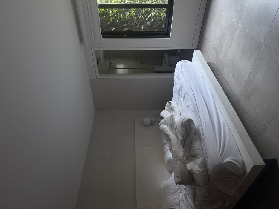 A bright room features a large window overlooking greenery. Next to the window is an open doorway leading to a bathroom, complete with a toilet and shower. A large, white bed is disheveled, its sheets rumpled in a messy pile. The room is clean, with neutral-colored walls and tiled floors. A small, square object is mounted on the wall beside the bed.