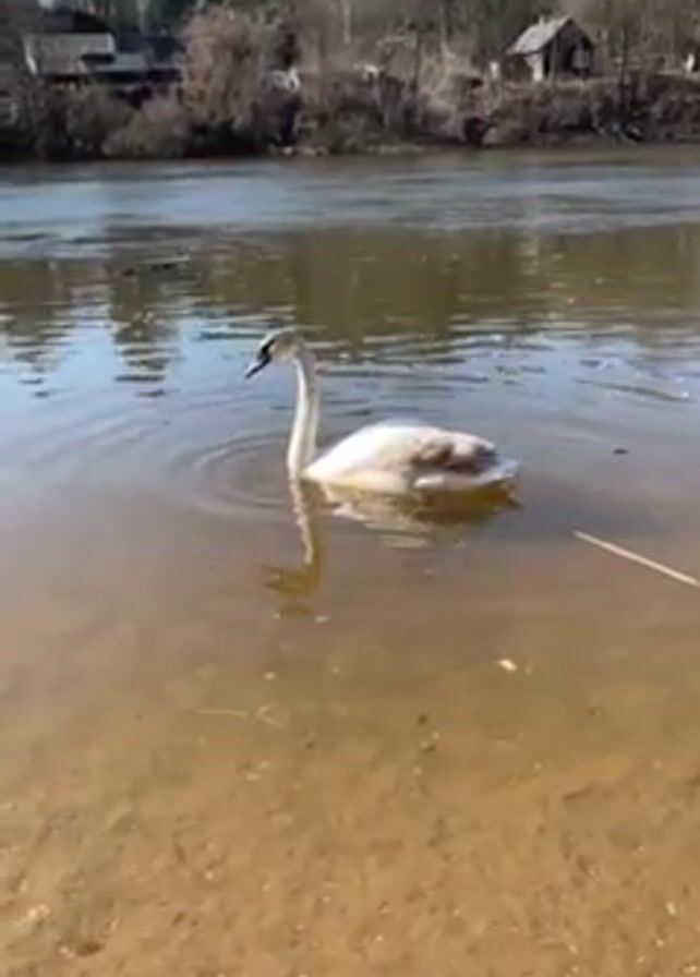 riverbank with a single swan. The swan is in the water close to the bank. The water is shallow and the bottom is sandy. The swan is primarily white with some grey feathers. The swan is looking to the left. In the background, on the opposite bank of the river, are houses and trees. The sky is blue and the day appears sunny.