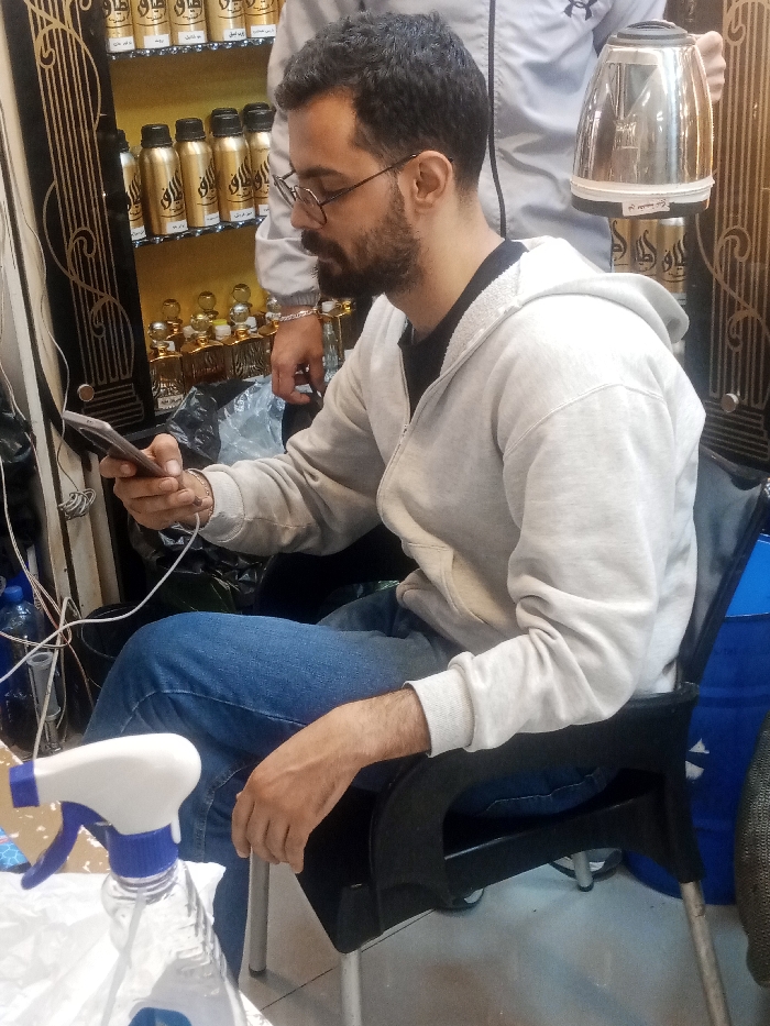 A male individual with short, dark, curly hair, a beard, and eyeglasses is seated in a black and silver chair, facing left and looking down at a smartphone held in his left hand. He wears a light gray zipped hoodie over a dark t-shirt and blue jeans. A white earbud wire extends from the smartphone. Partially visible behind him, a second male stands, wearing a light gray jacket. The background features shelving stocked with numerous gold-colored cylindrical bottles, some displaying Arabic script (e.g., "الفارس"), and smaller, ornate glass bottles, consistent with a fragrance or perfumery shop. A chrome electric kettle is visible on a shelf to the right. In the lower left foreground, a clear plastic spray bottle with a white nozzle and blue cap rests on a white surface. Various electrical cables are present on the left side of the frame. The scene takes place within an indoor commercial establishment in Unknown, Unknown.