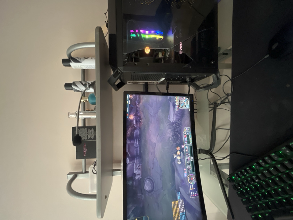 The scene depicts an indoor computer workstation in Dupnitsa, Bulgaria. A wide, curved computer monitor occupies the center-left, displaying a video game interface featuring a fantasy landscape with purple and green hues, showing on-screen game elements such as a mini-map, character abilities, and a chat log. To the right of the monitor stands a black computer tower with a transparent side panel, revealing internal components illuminated by multi-colored RGB lighting. A prominent crack is visible across the glass side panel of the computer tower, originating from the top right corner and extending diagonally downwards. Brands such as "MSI," "GeForce RTX," and "Cooler Master" are discernible within the case. A black microphone on a flexible boom arm is positioned above the monitor. In the foreground, a partially visible mechanical keyboard with green backlighting is situated on the lower left, adjacent to a black wired computer mouse resting on a black mouse pad on the lower right. The components are placed on a clear glass desk surface, beneath and around which multiple black cables are tangled. The background consists of a plain, light-colored wall. Mounted on this wall is a grey, two-tiered shelf. On the shelf, from left to right, are a black box labeled "VALENTINO," a clear glass bottle, a small turquoise bottle, and two black spray cans with white striped patterns, one of which is labeled "STR8." A white plastic container is also present on the far left of the shelf. No individuals are present in the image.