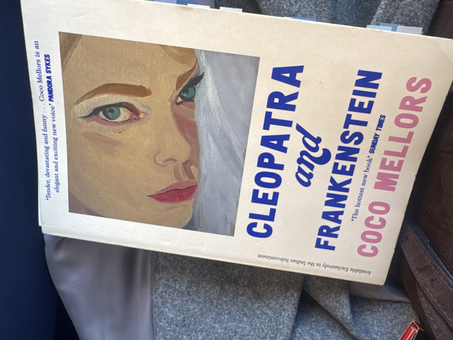 cover of the book "Cleopatra and Frankenstein" by Coco Mellors. A portrait of a woman with fair skin, green eyes, and red lips is prominently displayed on the left. The book title is written in blue, and the author's name is in pink. Quotes from Pandora Sykes and Sunday Times are featured. A note indicates the book is available exclusively in the Indian Subcontinent. The book rests on various fabric surfaces.