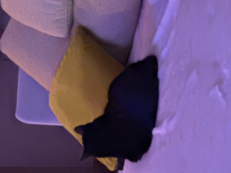 A black cat rests on a white, textured surface, potentially a blanket or bedspread. It's positioned near a stack of cushions: two light gray ones and a yellow one the cat is partially nestled against. The scene is bathed in purple light, giving the entire image a cool-toned appearance. The cat is the darkest object in the composition, contrasting strongly against the lighter shades of the cushions and bedding.