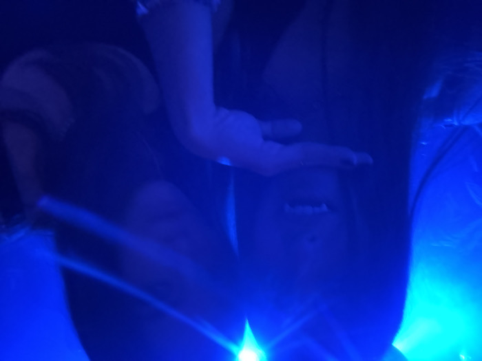This image depicts two individuals, primarily obscured by heavy blue artificial lighting and lens flares, within an indoor environment. The specific location within Mexico City, Mexico, cannot be determined from the visual data. The individual on the left, with long dark hair, has their mouth slightly open, revealing elongated, pointed canine teeth. Their right hand is raised, fingers bent, with dark nail polish visible, positioned below their chin. The second individual, on the right, also has long dark hair and is largely silhouetted, their features indistinguishable due to the lighting conditions. The overall environment suggests a nightclub or themed event setting.