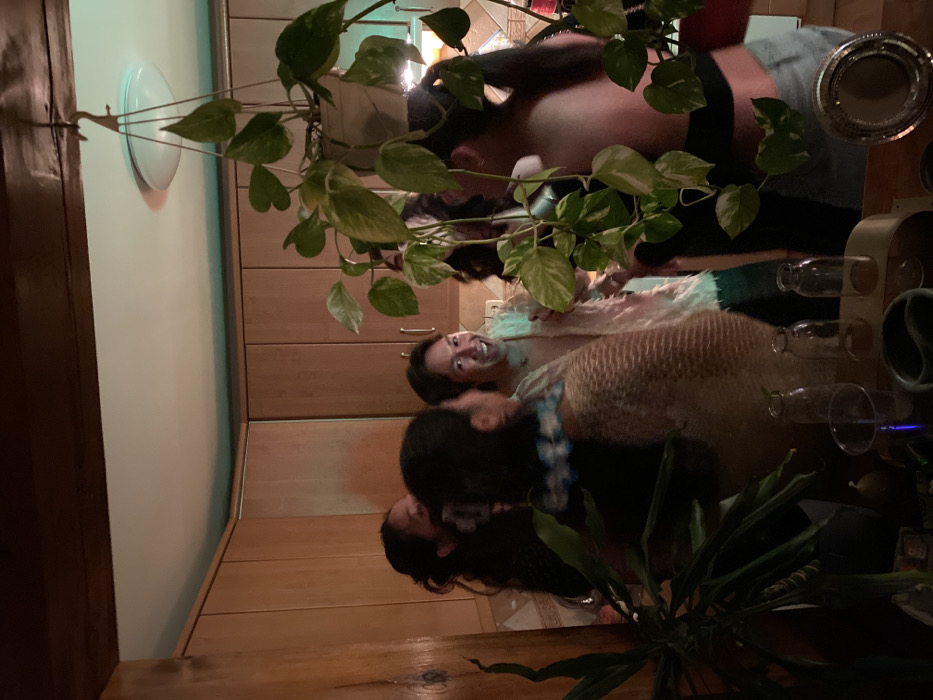 group of four people standing in a kitchen, which is likely located in Segovia, Spain. They are positioned close together, possibly engaging in a conversation. The environment is somewhat dimly lit, with a large leafy houseplant hanging from the ceiling. There are wooden cabinets in the background and several glass bottles and a glass on the counter in the foreground. The plant obscures some of the people's bodies, particularly the person standing on the far right, who is facing away from the camera. The person in the center, wearing a light teal shirt, is smiling and looking towards the camera, while the woman in the middle, wearing a patterned shawl-like garment, is facing the person in the teal shirt and is looking away from the camera. The other two people are obscured. The mood in the image seems jovial.