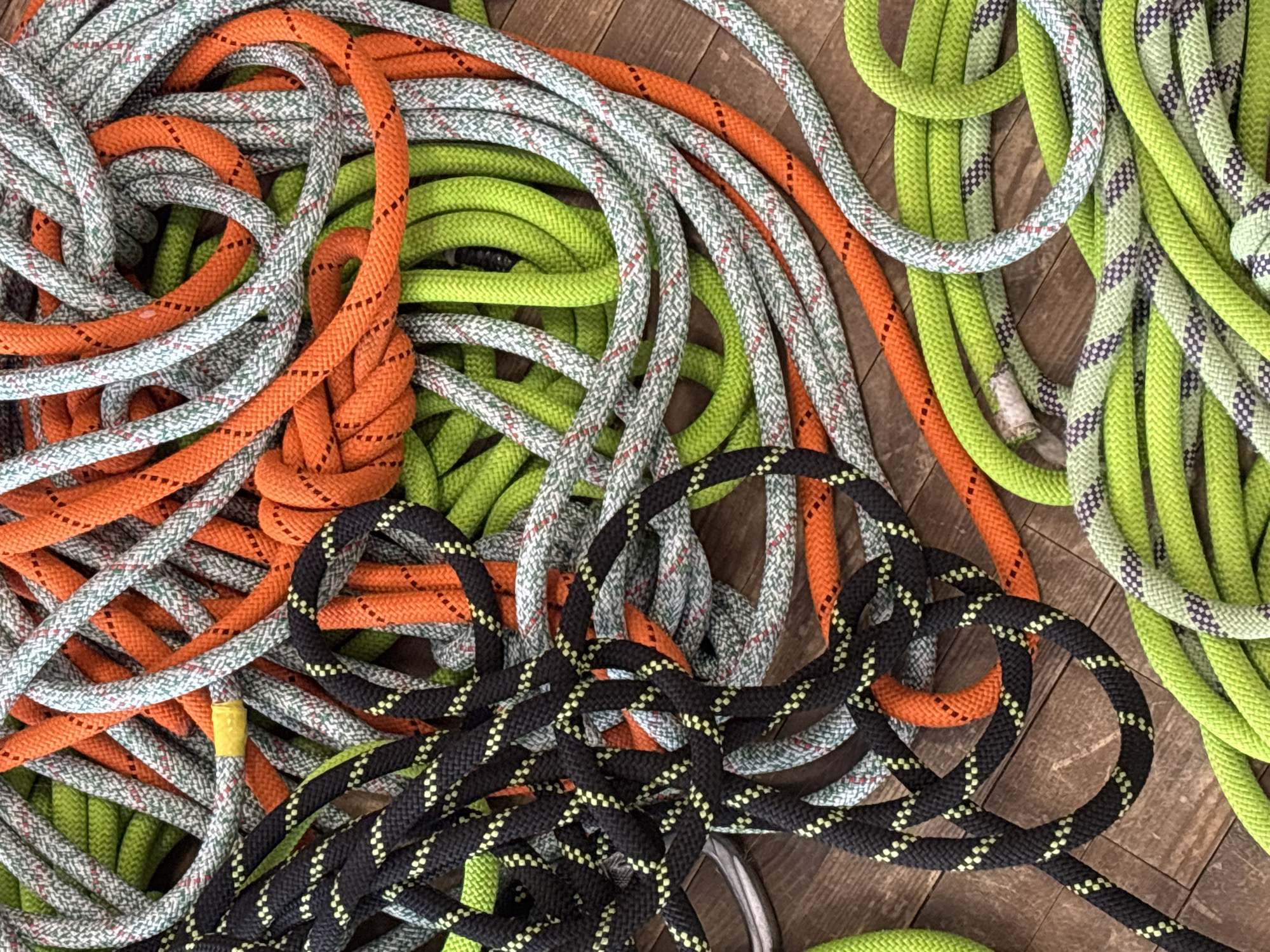 A substantial, disorganized pile of coiled ropes is depicted resting on a brown wooden plank surface