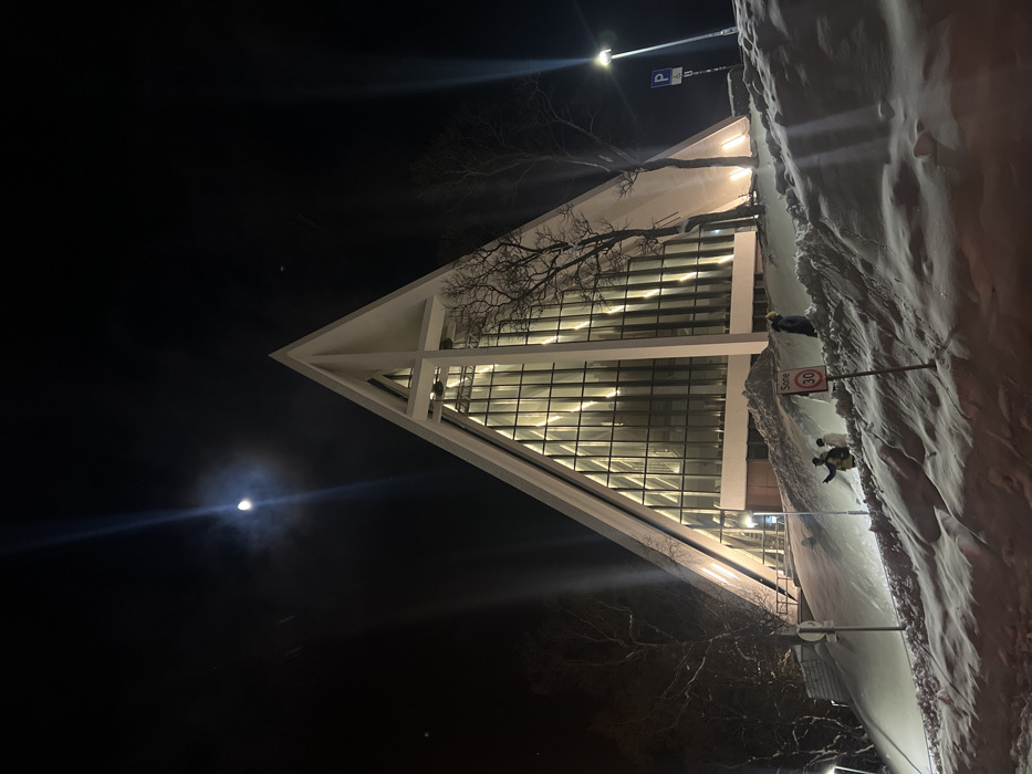 A nighttime scene features a triangular building with a glass facade illuminated from within. A bare tree partially obscures the building's structure. Snowdrifts border the building. A street lamp and parking sign are visible near the structure. A speed limit sign reads "Zone 30". The moon is visible in the dark sky, casting a faint glow.