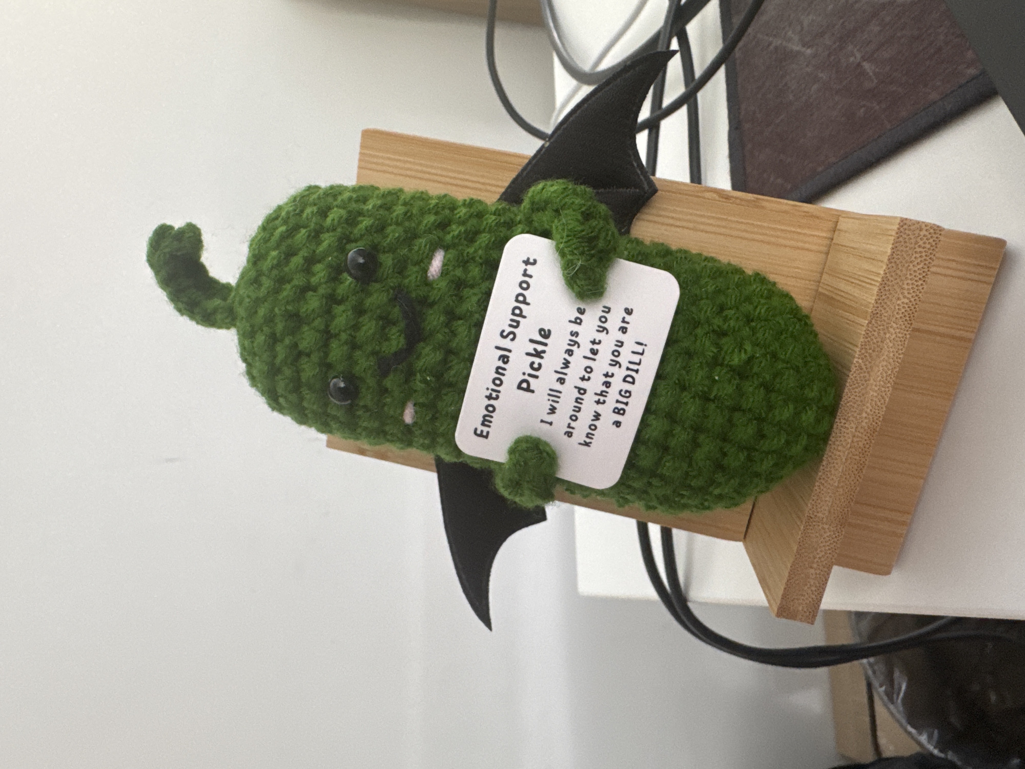 Here is a detailed description of the image: A crocheted green pickle is propped up by a wooden stand. The pickle has a smiling face with pink cheeks and black beady eyes. It is holding a tag that reads, "Emotional Support Pickle, I will always be around to let you know that you are a BIG DILL!" The pickle also has black wings attached to its back. The setting appears to be an indoor space, with a white wall and a desk or table visible in the background. The scene is brightly lit, suggesting a well-lit room.