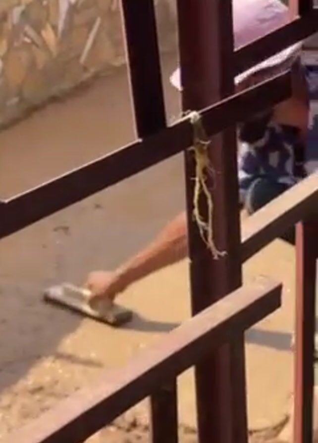 man through a metal gate. He is squatting and using a rectangular tool, possibly a trowel or smoothing stone, to work on a light brown, wet surface. The ground appears uneven and possibly muddy, with some exposed dirt areas. The man is wearing a blue and white patterned shirt, dark pants, a light-colored hat, and white shoes. The gate is made of dark-colored metal with a simple grid pattern. The background includes a beige wall with patterned tiles and some indistinct objects. The lighting is somewhat dim, suggesting it might be evening or an indoor setting with subdued light.