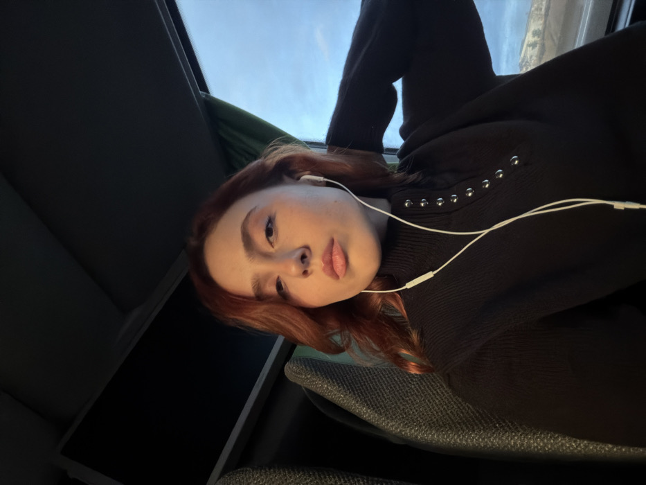 A young woman with auburn hair wearing earbuds is seated inside what appears to be a vehicle. She has fair skin and is wearing a dark-colored, long-sleeved shirt or sweater adorned with decorative metal hardware near the collar. The background includes a window showing the sky, possibly at dawn or dusk. The interior of the vehicle has dark elements, suggesting a car or bus setting.