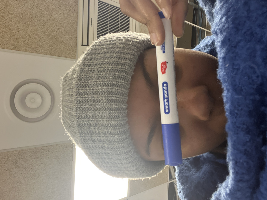 An individual with a medium-dark skin tone, wearing a grey knitted beanie and a blue textured garment, is depicted from an upward-facing perspective. Their eyes are obscured by a white "smart panda" brand dry erase marker with a blue cap and "BULLET TIP" graphic, held horizontally across the upper face. The background consists of a white acoustic tile ceiling with a circular air vent. To the upper right, a white Panasonic air conditioning unit with a grille is mounted high on a wall, adjacent to a textured, light-colored acoustic wall panel. A bright, diffused light source is visible on the upper left. The scene takes place indoors, in what appears to be a commercial or institutional building in Paris, France.
