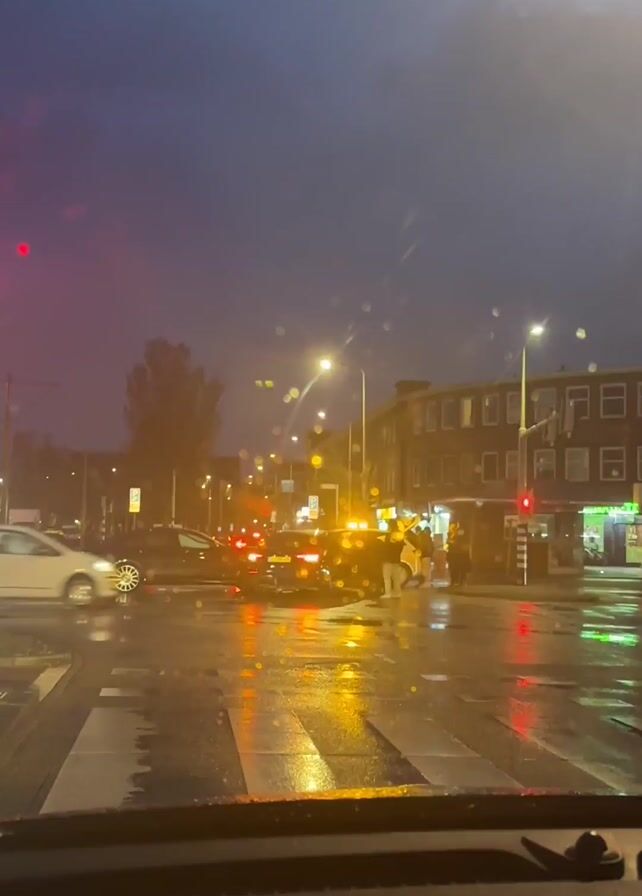 view from inside a car at a traffic light at a wet intersection on a dark, rainy evening. The traffic light facing the car is red with a left turn arrow. Other traffic lights at the intersection can be seen in the background. Several cars are stopped at the intersection, including a white car that drives across the intersection. On the right side of the video, several people are standing around a dark-colored car that has its hazard lights flashing. The buildings along the street are brick and appear to be apartments or businesses. The street is wet and reflective, with streetlights adding to the ambient illumination. The sky is a dark, overcast gray.