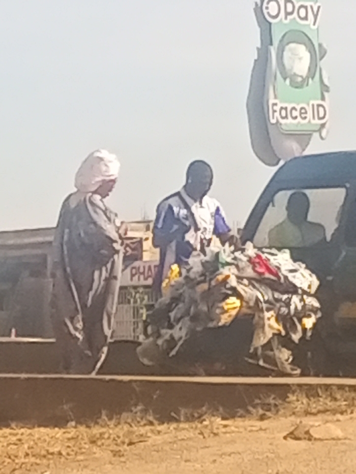 The image depicts an outdoor urban roadside scene in Jos, Nigeria, under daylight