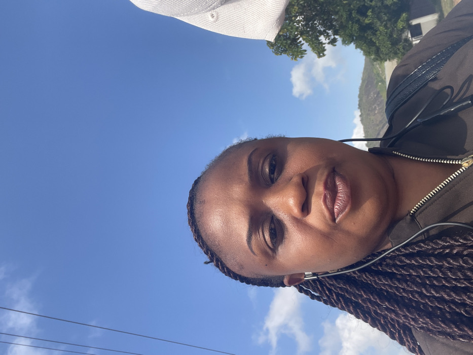 A medium close-up, high-angle selfie photograph shows an adult Black female with dark braided hair, wearing a dark zippered top and in-ear headphones, looking directly at the camera with a neutral expression
