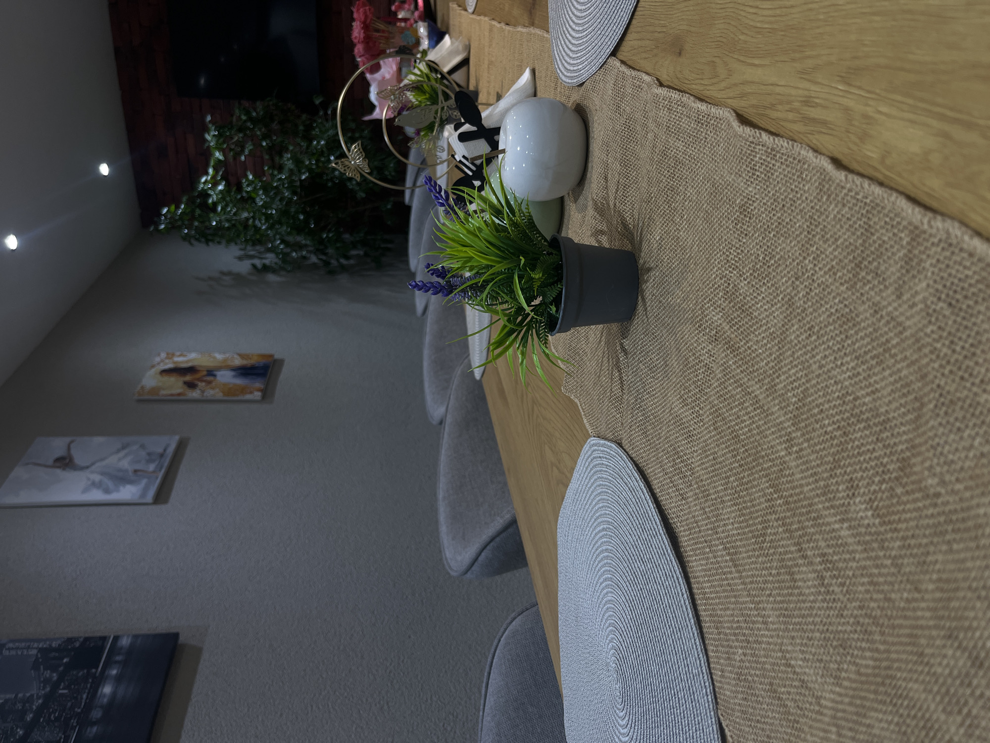dining table in a room. A long beige runner stretches across the table's wooden surface, punctuated by round, grey placemats. A small potted plant sits near the foreground, alongside a white decorative apple. Other decorative floral arrangements can be seen further down the table. Chairs are positioned along the table's side, with grey upholstery. In the background, there's a wall with three framed artworks and a large green plant near a dark-colored wall. The presence of artworks and decorative items suggests a residential setting, potentially in Belitsa, Bulgaria, as specified.