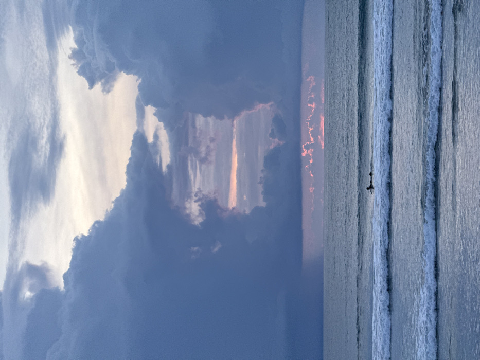 The image depicts an oceanic scene at Kuta, Indonesia, during what appears to be either sunrise or sunset. The sky is dominated by voluminous, dark blue-grey storm clouds, which frame a roughly rectangular central opening. Through this opening, lighter sky is visible, with a horizontal band of soft orange and pink light positioned centrally. Below this, nearer the horizon, a more intense band of reddish-orange light illuminates the underside of low-hanging clouds. To the far left, a dense, dark grey cloud mass extends downward, suggesting localized precipitation. The ocean surface is a cool blue-grey, with three distinct lines of white-capped waves visible in the foreground and middle ground, moving towards the viewer. In the mid-ground, a single individual is observed lying prone on a surfboard, actively paddling, positioned between the second and third wave lines from the foreground. The individual and surfboard are silhouetted against the water and distant horizon.