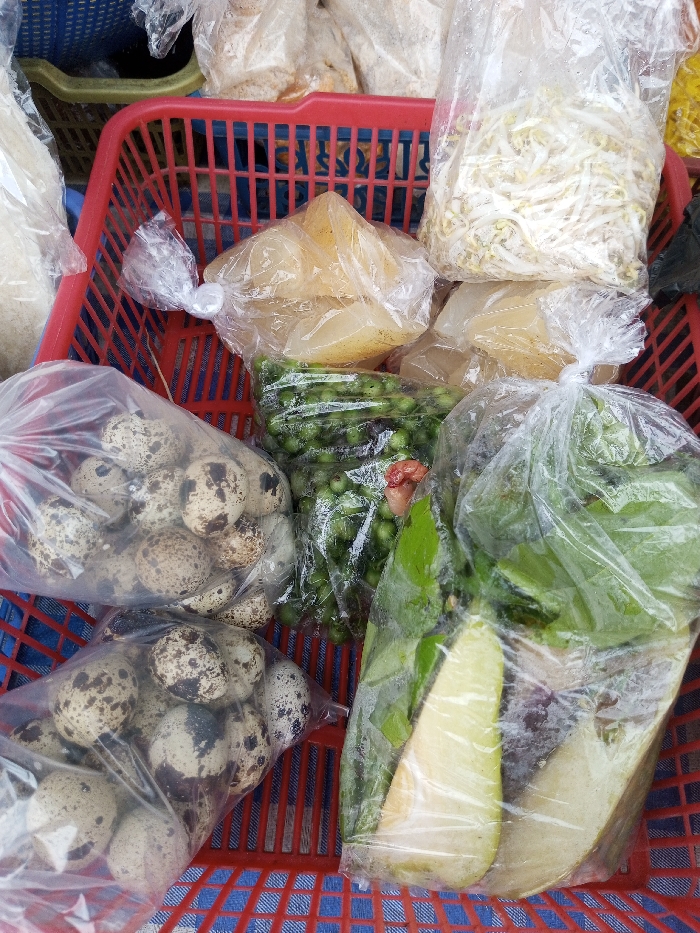 A red plastic basket contains various food items packaged in clear plastic bags. These include two bags filled with speckled quail eggs, a bag of small green peas, two bags of translucent yellow jelly-like squares, a bag of bean sprouts, and a bag containing green leafy vegetables with two pieces of light green fruit. The basket sits on a blue and white checkered surface. Additional bags of unidentified items are visible in the background.