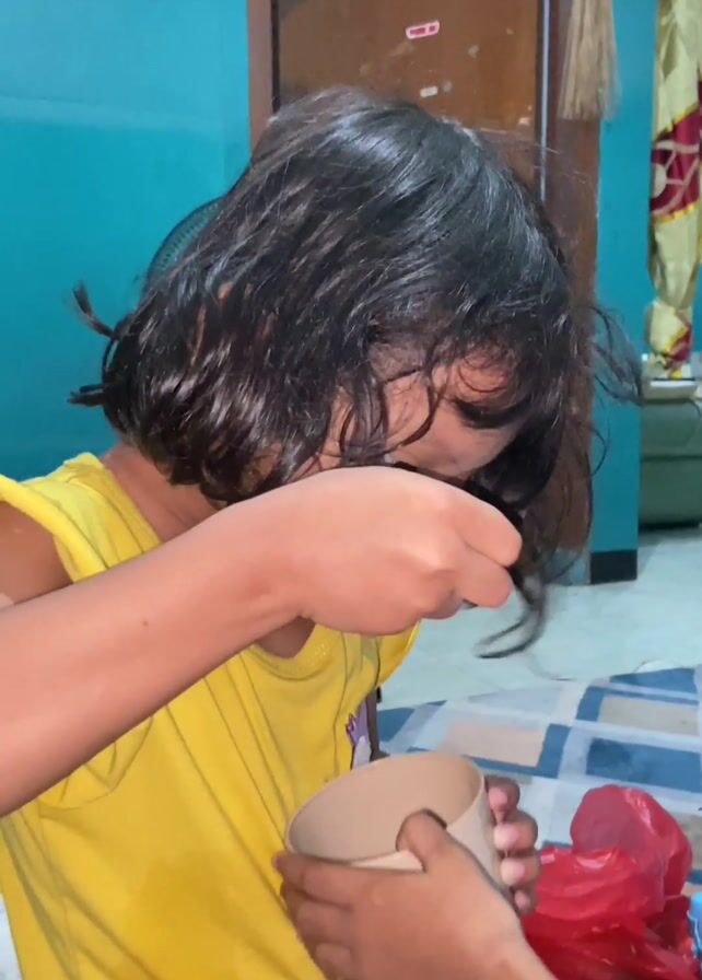 A young girl with dark, shoulder-length, curly hair is the central focus of the video. She is wearing a bright yellow short-sleeved shirt, and a sliver of a white undergarment is visible at the top of her shirt. The girl is holding a beige-colored cup in her left hand and using a silver spoon to stir the contents of the cup. After stirring, she brings the spoon to her mouth to taste the contents. Her expression is focused and intent. The background includes a teal-colored wall on the left, and a partially visible dark wooden door to the right. A small broom is leaning against the wall near the door. Further back, there's a patterned curtain and a glimpse of a green object that appears to be a piece of furniture. In the foreground, near the bottom of the frame, are red and blue plastic items, possibly bags or containers, resting on a patterned floor. The lighting in the room appears to be mixed, with some areas brighter than others.