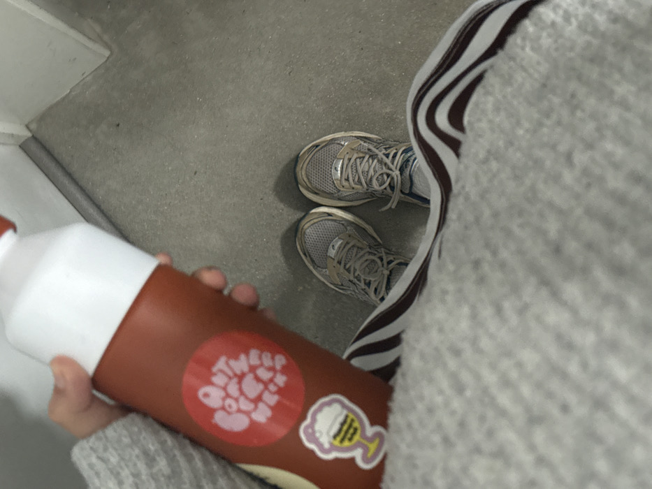 An overhead photograph captures a person standing indoors. A light-skinned hand, clad in a light grey knit sweater, holds a brown cylindrical bottle topped with a white screw-on cap. The bottle displays a prominent red circular sticker featuring stylized white text that reads "Antwerp" and, below it, a smaller sticker depicting a yellow goblet with pink foam. The person's lower body is visible, wearing a garment with brown and white stripes, white socks, and grey athletic shoes with white laces and soles. They stand on a uniform light grey floor, possibly concrete. In the upper right quadrant, a white door frame with a grey door seal or weatherstripping is present. The "Antwerp" sticker indicates the scene is located in the city of Antwerp, Belgium.