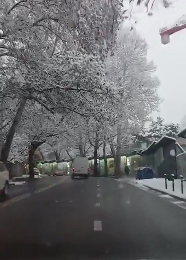 street on a snowy day. The road is wet and the trees are covered in snow. There are cars driving on the road and a person walking on the sidewalk. There are also small building structures on the side of the road with green roofs. In the background, there is a tall crane. The video appears to be taken from inside a moving vehicle.