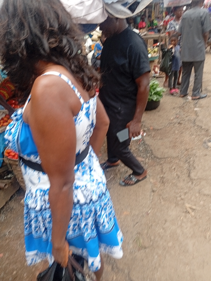 This image depicts a bustling outdoor market scene in Onitsha, Nigeria. In the immediate foreground, a person, viewed from behind, wears a white and blue patterned sundress with thin shoulder straps and a visible black waist strap. This individual has dark, curly hair and holds a dark bag in their right hand, positioned near their leg. To the left, a small quantity of red produce is visible on a surface, likely a market stall. In the midground, a male figure is observed in profile, wearing a black t-shirt, dark trousers, and dark sandals. He carries a light-colored item, possibly fabric, on his head and holds a dark grey smartphone in his right hand. A potted green plant is visible on the unpaved ground between the foreground and midground figures. The background is populated with blurred figures, including a child in a blue outfit and pink shoes, and another adult male in a light grey top and dark trousers. Various market stalls with merchandise and overhead coverings are also visible. The ground consists of uneven, packed earth. The scene indicates an active open-air market environment during daylight hours.