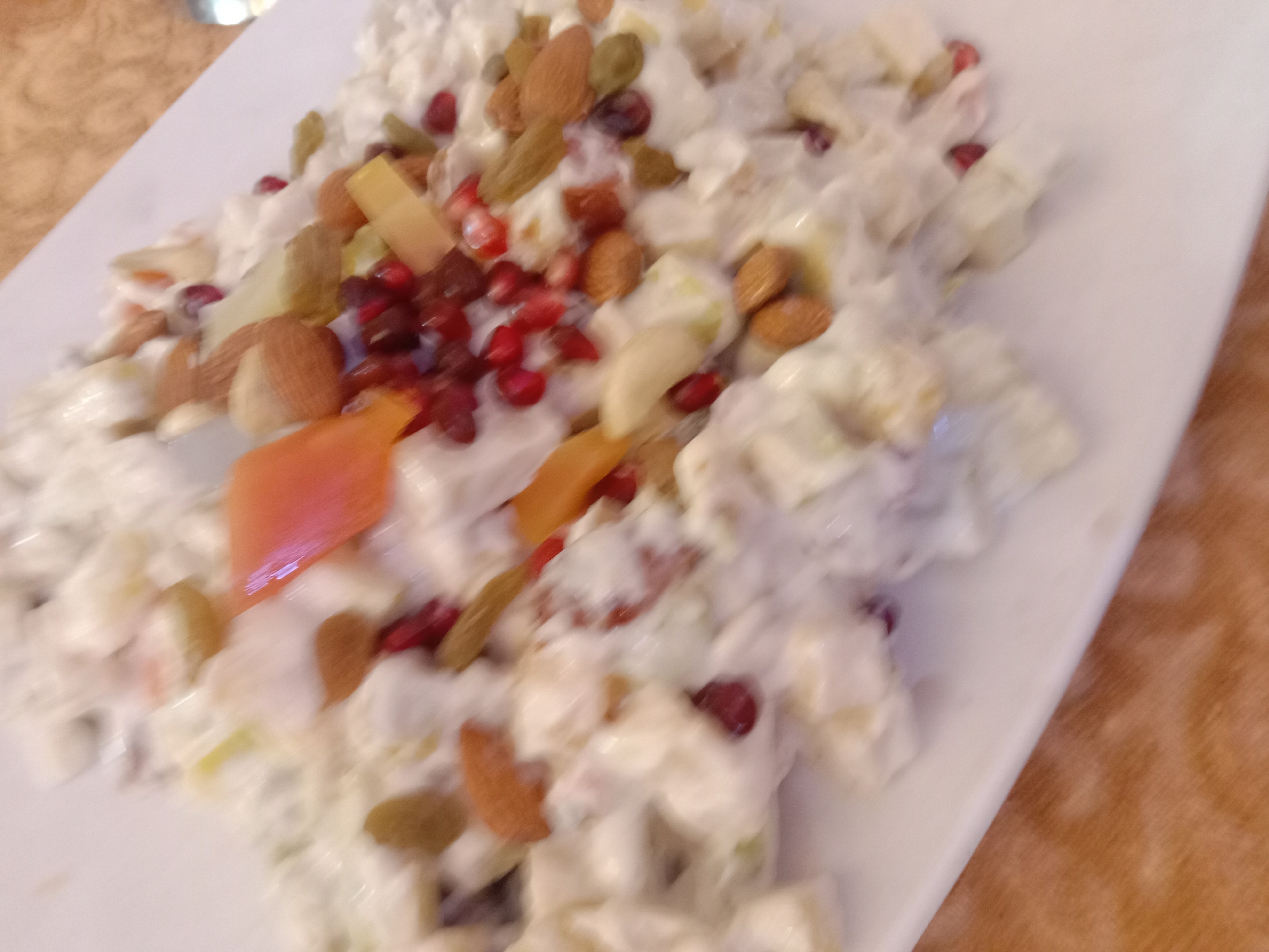An overhead, slightly out-of-focus image depicts a dish of fruit salad served on an elongated, off-white rectangular plate. The salad consists of a white, creamy base interspersed with diced fruit pieces, including light-colored cubes (likely apples or bananas), bright red pomegranate seeds, whole brown almonds, greenish-yellow raisins, and scattered elongated orange-colored fruit pieces (possibly papaya or mango). The plate rests on a textured surface, which appears to be a light brown or orange-tan tabletop. The scene is located in the city of Kot Bhattian, Pakistan.