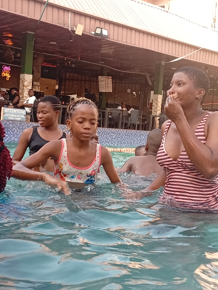 Three young women are waist-deep in a swimming pool. The woman on the right has short hair and wears a striped swimsuit. She looks to the side with her hand near her mouth. The girl in the center has braided hair and a swimsuit with a cartoon design. To her left is another girl with a black swimsuit. Other people are in the background, sitting at tables on a patio with a partially visible building overhead. An "Attention" sign is also visible.