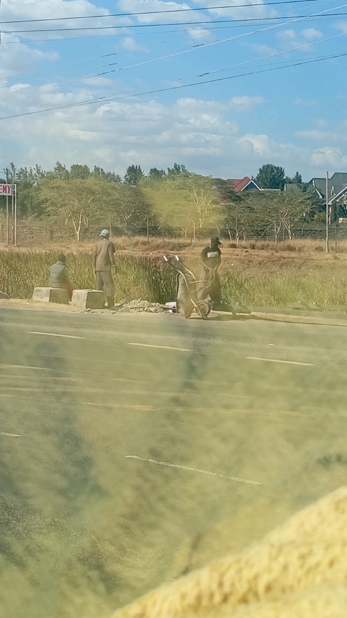 Three people work on the side of a road. One person sits on a concrete block, another stands near a pile of debris, and the third person is next to a wheelbarrow. The road stretches across the bottom of the frame. Beyond the road is a grassy area with trees and houses in the distance. The sky is blue with scattered clouds. Utility lines run across the top of the image.