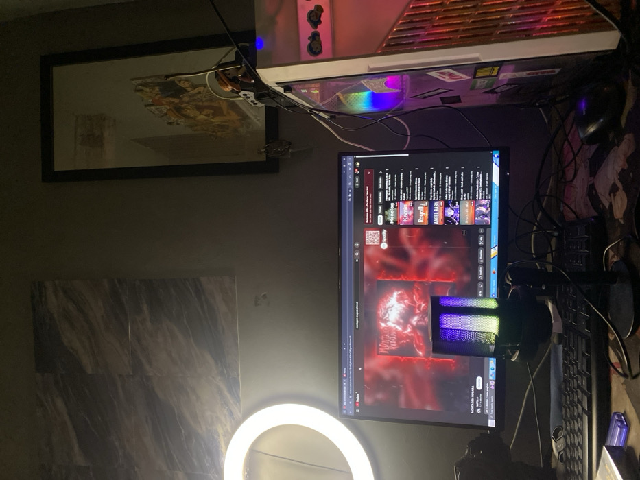 The image captures a dimly lit computer workstation in Pacet, Indonesia