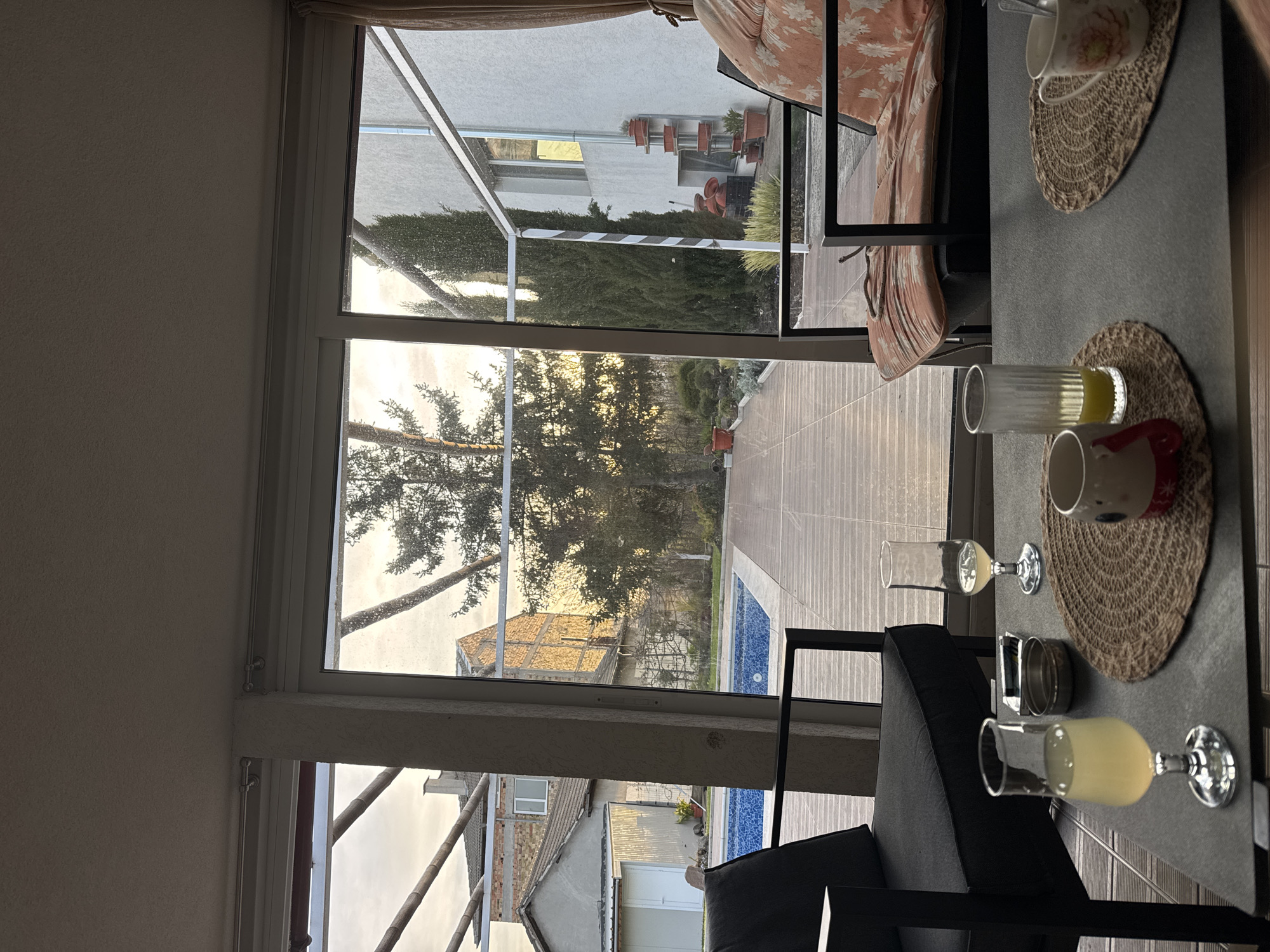 n indoor dining table set with drinks and cups on woven placemats. A modern black chair is partially visible next to the table. Through a large window, a view of a backyard with a swimming pool, trees, and nearby houses is visible. The backyard appears to be in a residential area with a mix of foliage and architecture. The location is identified as Bulgarovo, Bulgaria based on the houses visible and pool.