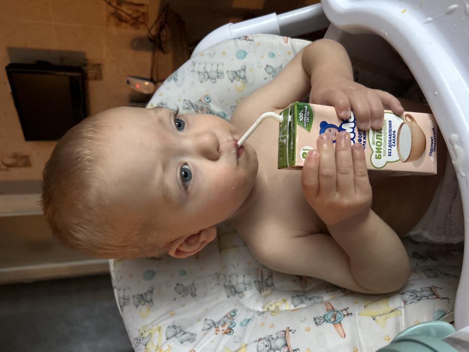A toddler with light blonde hair and blue eyes is seated in a white high chair with a fabric liner patterned with teddy bears, airplanes, and balloons. The child, bare-chested and wearing a white diaper or underwear, is actively drinking from a small pinkish-beige carton through a white bent straw, with visible milk residue around the mouth. The carton, held by both hands, is labeled in Russian as "БИОЛАКТ" (Biolact), a "ДЕТСКИЙ КИСЛОМОЛОЧНЫЙ" (children's fermented milk) product "БЕЗ ДОБАВЛЕНИЯ САХАРА" (without added sugar) and with "100% НАТУРАЛЬНЫЙ СОСТАВ" (100% natural composition). The background reveals a light-colored tiled wall, a mounted black flat-screen television, a white device with a red indicator light, and black wires, indicating a domestic interior such as a kitchen or dining area in Voskresensk, Russia.