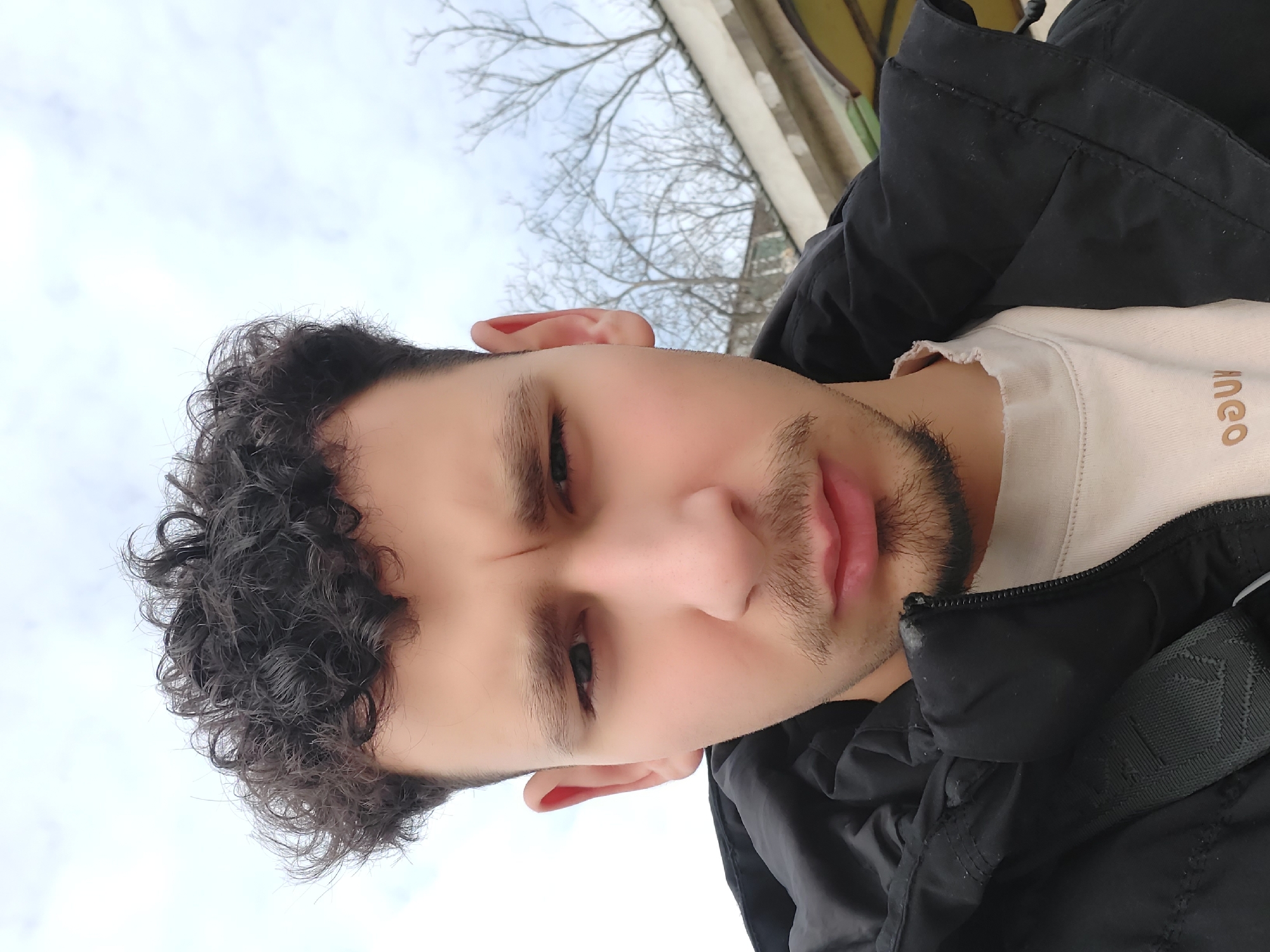 The image presents a close-up portrait of a young adult male with dark, curly hair and a light complexion. He has dark eyes and his eyebrows are slightly furrowed. Facial hair includes stubble, a mustache, and a goatee. He is wearing a black hooded puffer jacket, partially unzipped, over a light beige, crew-neck shirt with a visibly frayed collar. A black strap is visible across his left shoulder. The background features an overcast sky with scattered clouds. On the right, leafless tree branches are visible above a partial view of a light-colored building structure, indicating an outdoor setting. The scene is located in the city of Gorna Oryahovitsa, Bulgaria.