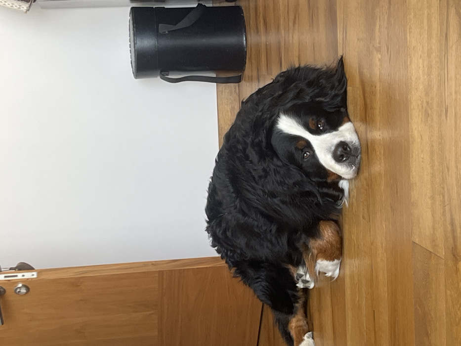 - "A Bernese Mountain Dog rests on a wooden floor" by FM-8oYor1, licensed under CC BY 4.0
