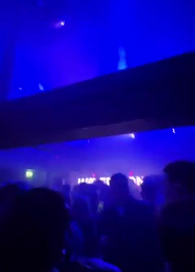 crowded nightclub with people dancing. The lighting is predominantly blue and white, with occasional flashes of green and red. A disco ball hangs from the ceiling, reflecting the light. Some of the clubbers appear to be filming or taking photos. The music is loud and upbeat.