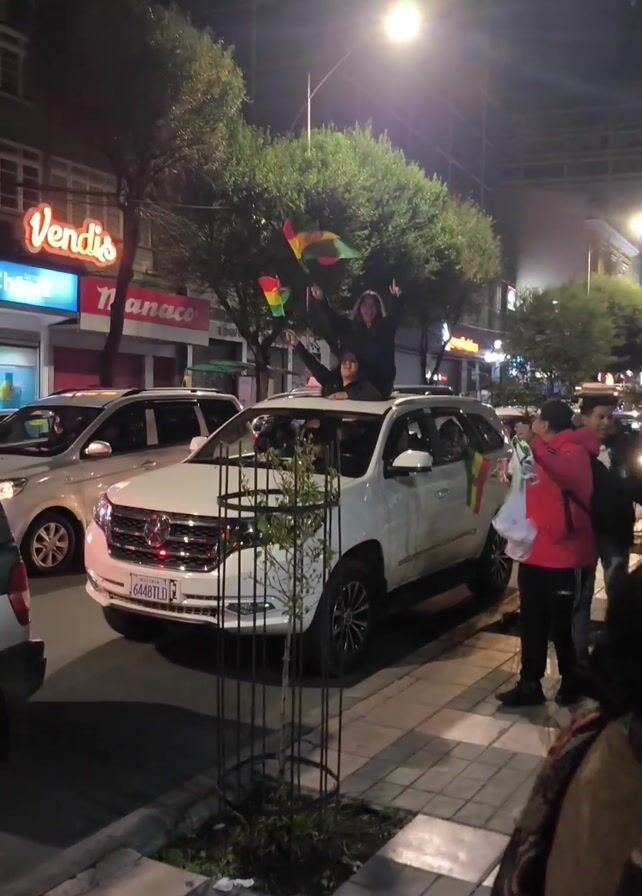 people celebrating in the street at night. Several people are waving Bolivian flags. Some individuals are standing on top of a white SUV. Cars are lined up in the street. Other people are on the sidewalk holding cups and drinks. Buildings and street lights are visible in the background.
