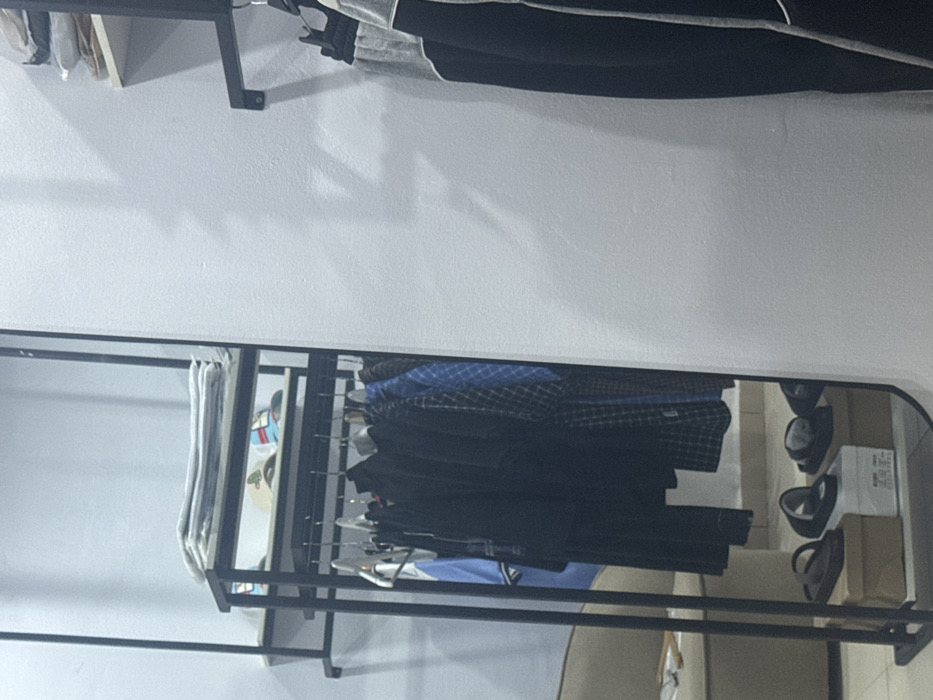clothing rack reflected in a mirror. The rack holds various garments, including shirts and pants in shades of blue, black, and gray. Shoes and boxes are visible on the floor below. Some clothing items hang above the mirror's reflection. The wall behind both the rack and mirror is white. The mirror has a rounded edge.