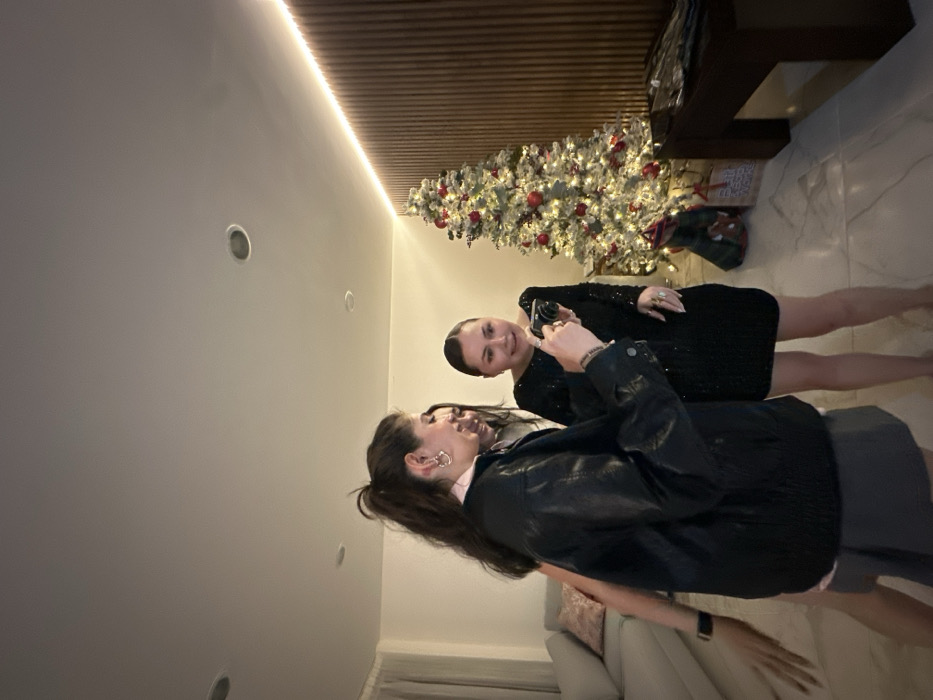 Two women pose in a brightly lit room with a Christmas tree in the background. One woman holds a camera, focusing on taking a picture, while the other stands next to her. A leather jacket is worn by the woman in the foreground. The room has a modern interior design with a light wood ceiling and recessed lighting. A sofa can be seen in the bottom portion of the image.