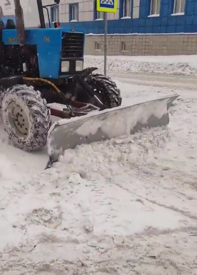 A blue tractor with a front-mounted snowplow is clearing a snow-covered street. The tractor, labeled "BELARUS 82.1", is moving forward, pushing a substantial amount of snow to the side. The large tires of the tractor are visible, covered in snow. The street is icy and compacted with snow, with tire tracks marking the tractor's path. In the background, buildings are visible, some with blue accents, and a pedestrian crossing sign. A person is walking in the background. The tractor has a logo of "Леспаркхоз" on its side. The weather is snowy and overcast.