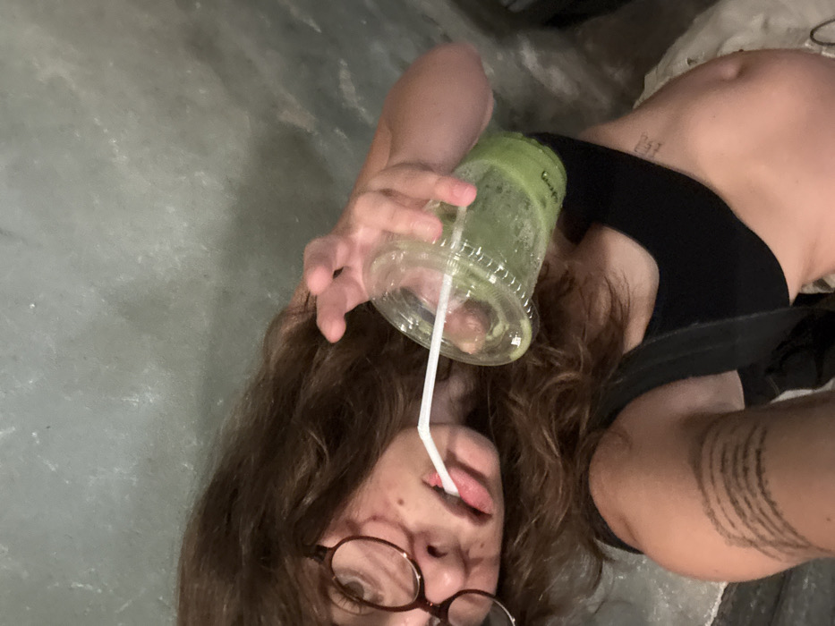 A female individual with long, wavy brown hair and round, brown-framed glasses is depicted in a close-up, high-angle selfie. She holds a transparent plastic cup containing a light green beverage, likely a smoothie or juice, with a white plastic straw inserted into her mouth. Her lips are slightly parted around the straw. She wears a black top, possibly a sports bra or crop top, exposing her midriff. A tattoo consisting of several dark, horizontal bands is visible on her upper left arm, and a faint tattoo, possibly text or numbers, is visible on her left side near the rib cage. The background is a plain, textured grey wall. The scene is located in Chiang Mai City Municipality, Thailand.