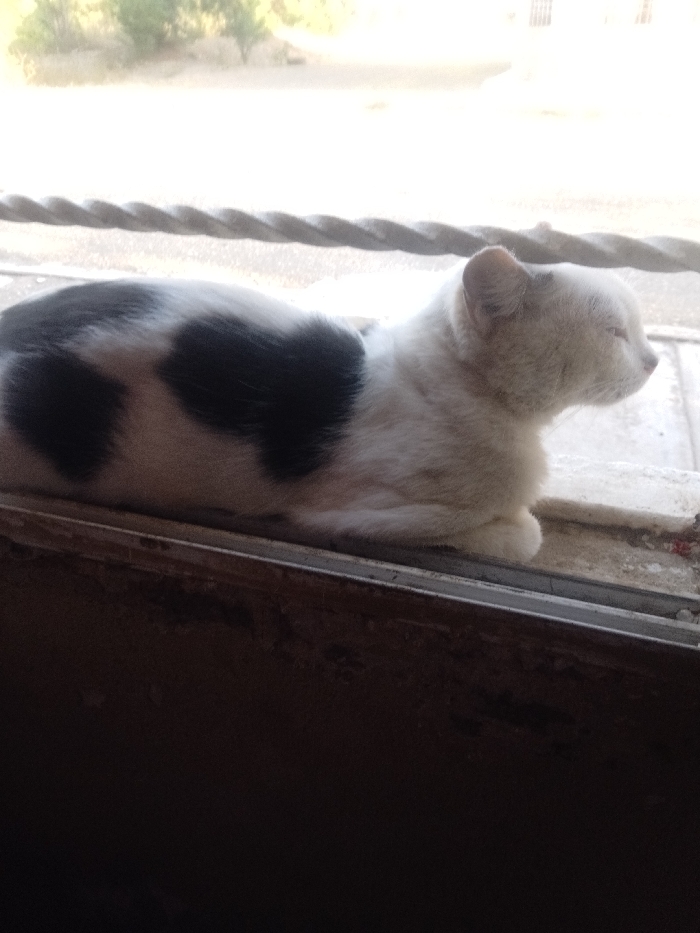 - "A black and white cat is depicted in a reclined position on a dirty, light-colored window ledge, facing right" by FM-Juqnh1, licensed under CC BY 4.0