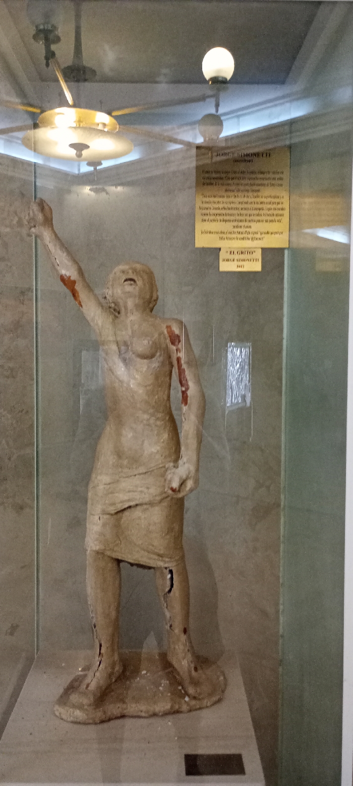 - "A photograph depicts a weathered sculpture titled "El Grito" by Jorge Simonetti, 2015, encased in a glass display" by FM-kzA8r2, licensed under CC BY 4.0