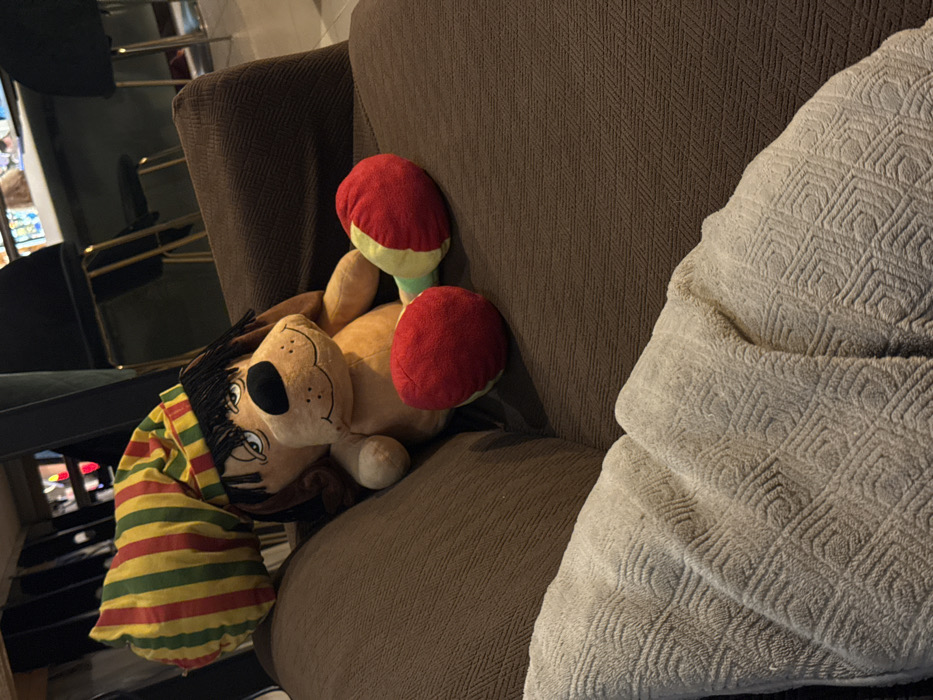 The image displays an indoor scene located in Palma, Spain. A light brown plush dog toy, featuring black plastic eyes, a dark brown snout, and black shaggy hair, is seated upright on a brown, textured sofa. The plush dog wears a conical hat with vertical red, yellow, and green stripes. Its lower limbs are segmented, with red feet and intermediate yellow and green sections. In the immediate foreground, a cream-colored, textured blanket with a geometric pattern is visible, draped over a portion of the sofa. The background, dimly lit and out of focus, reveals dark-colored barstools with metallic frames positioned behind what appears to be a counter or bar area, suggesting a lounge or living space. No people are visible. No actions or interactions are occurring; the scene is static.