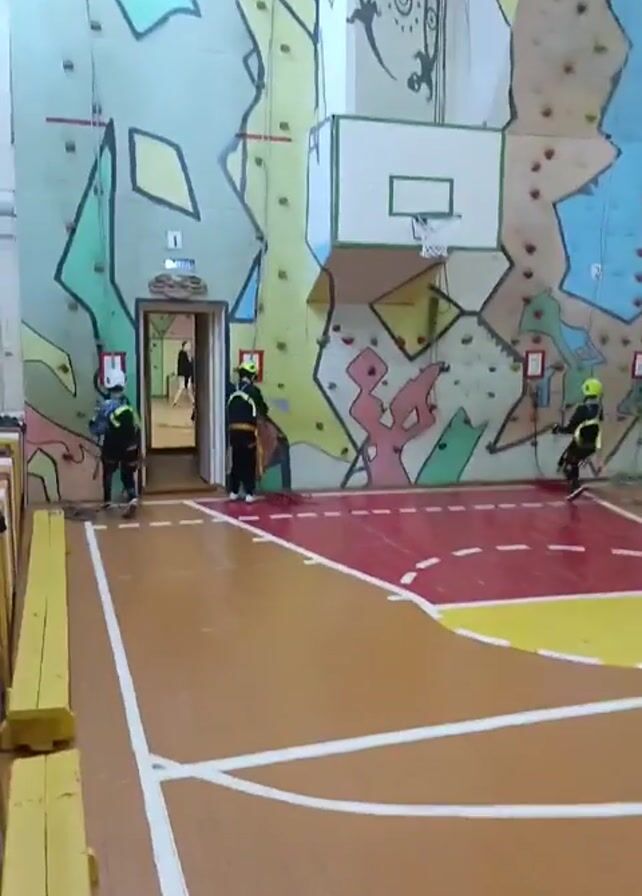 four people dressed in dark-colored clothing and yellow helmets, walking and running inside a large, brightly-lit gymnasium. They each carry a rope-like object. The gym has a painted basketball court on a wooden floor, and a large wall that appears to be set up for rock climbing, with colorful painted designs. There's a basketball hoop in the center of the wall. One person enters the gym from a door on the side. The individuals are scattered around the court, walking towards the climbing wall. One person runs towards the camera.