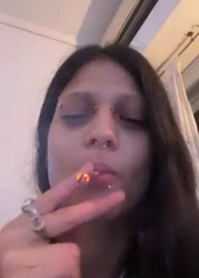 A person with dark hair is smoking a cigarette. They are wearing a white t-shirt, a silver necklace, and multiple rings. They have piercings on their eyebrows, nose, and lip. The background appears to be a room with a white ceiling and a window.