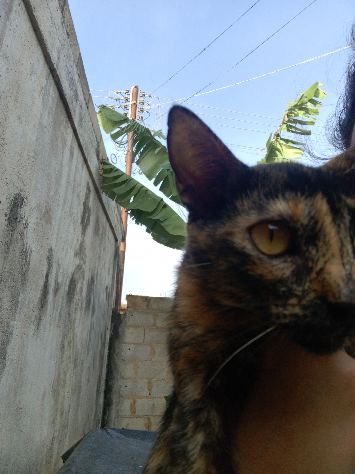 A close-up photograph taken in Tinaquillo, Venezuela, shows a person holding a tortoiseshell cat. The cat's head and part of its body are in the foreground. Its eye is focused. The background includes a weathered concrete wall, a brick structure, a utility pole with banana leaves partially obscuring it, and a blue sky. Electrical wires are visible above. The scene is outdoors, and the lighting suggests it's daytime.