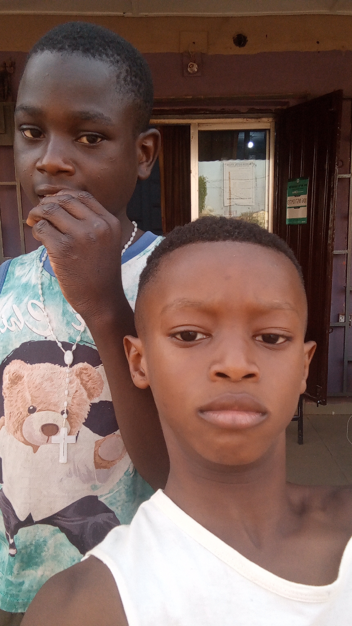 Two young, dark-skinned boys stand close together, likely in front of a building. The boy in the foreground is wearing a white sleeveless shirt, while the boy behind him wears a blue-green t-shirt with a teddy bear graphic and a white beaded necklace with a cross pendant. The background appears to be a storefront or office building. Through the window, a document is visible. Based on the available information, a reasonable estimate is that the location is Sabon Tasha, Nigeria.