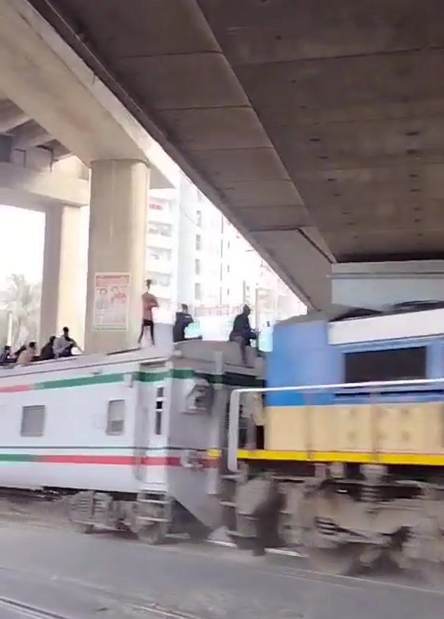 train moving under a bridge or elevated structure. The train is white with green and red stripes and has several people sitting on the roof of the train car. The people on the train roof appear relaxed, some sitting and some standing. The train is traveling on a track next to a road. Other buildings can be seen in the background. The video is taken from a low angle, looking up at the train and the overpass.