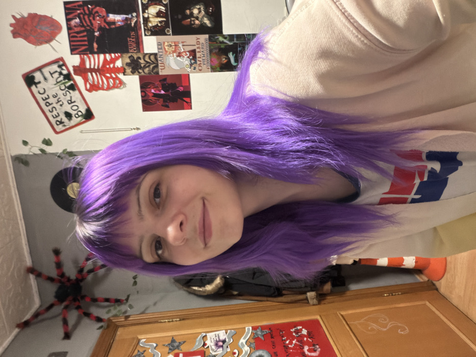 A woman with vibrant purple hair looks into the camera. Her room is decorated with posters, including Nirvana, and quirky items like a spider decoration on the wall. A "Respect The Borscht" sign is also visible. The room's door is also uniquely decorated with various shapes. She wears a white sweatshirt, with a red, white, and blue design on the chest.